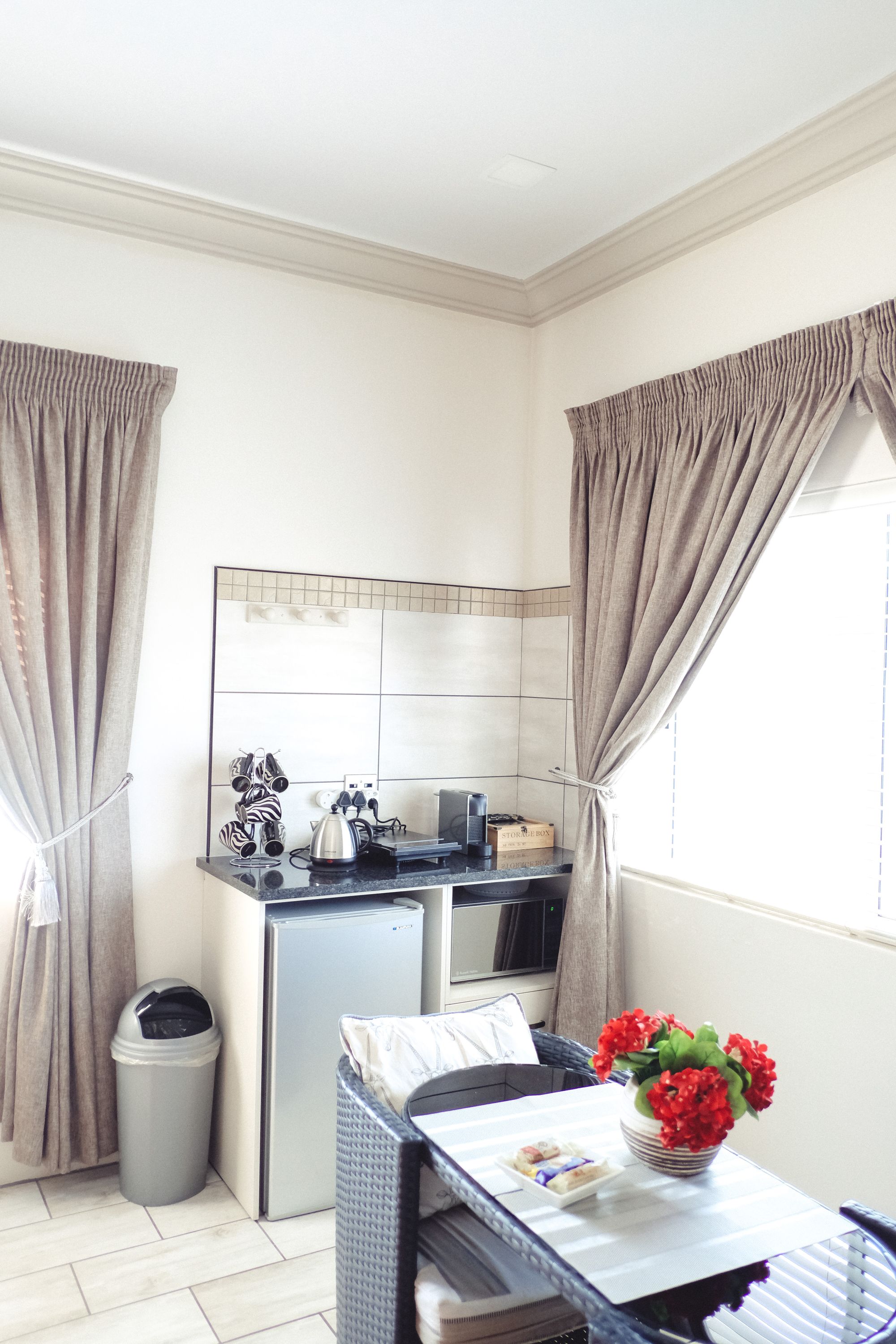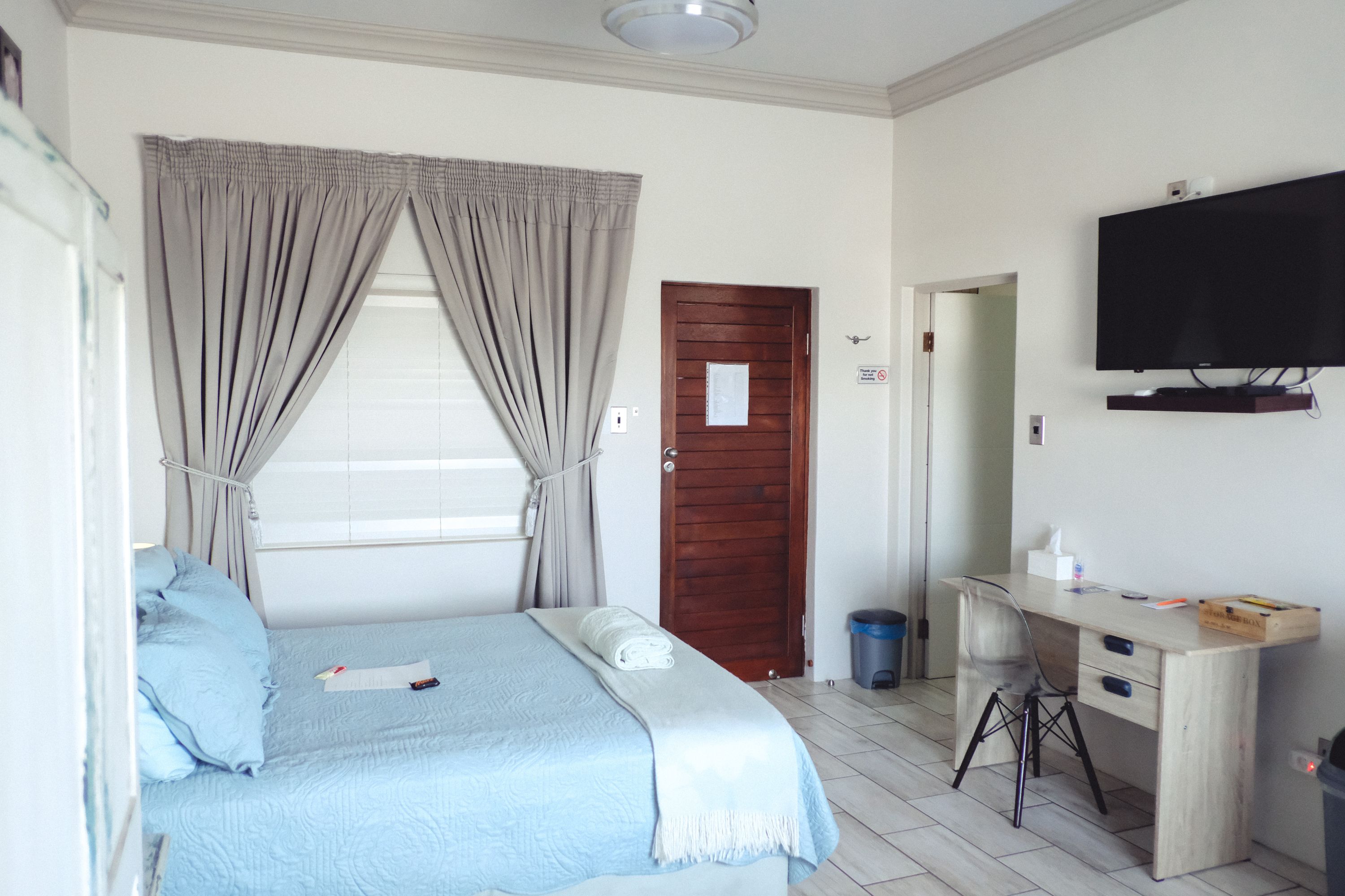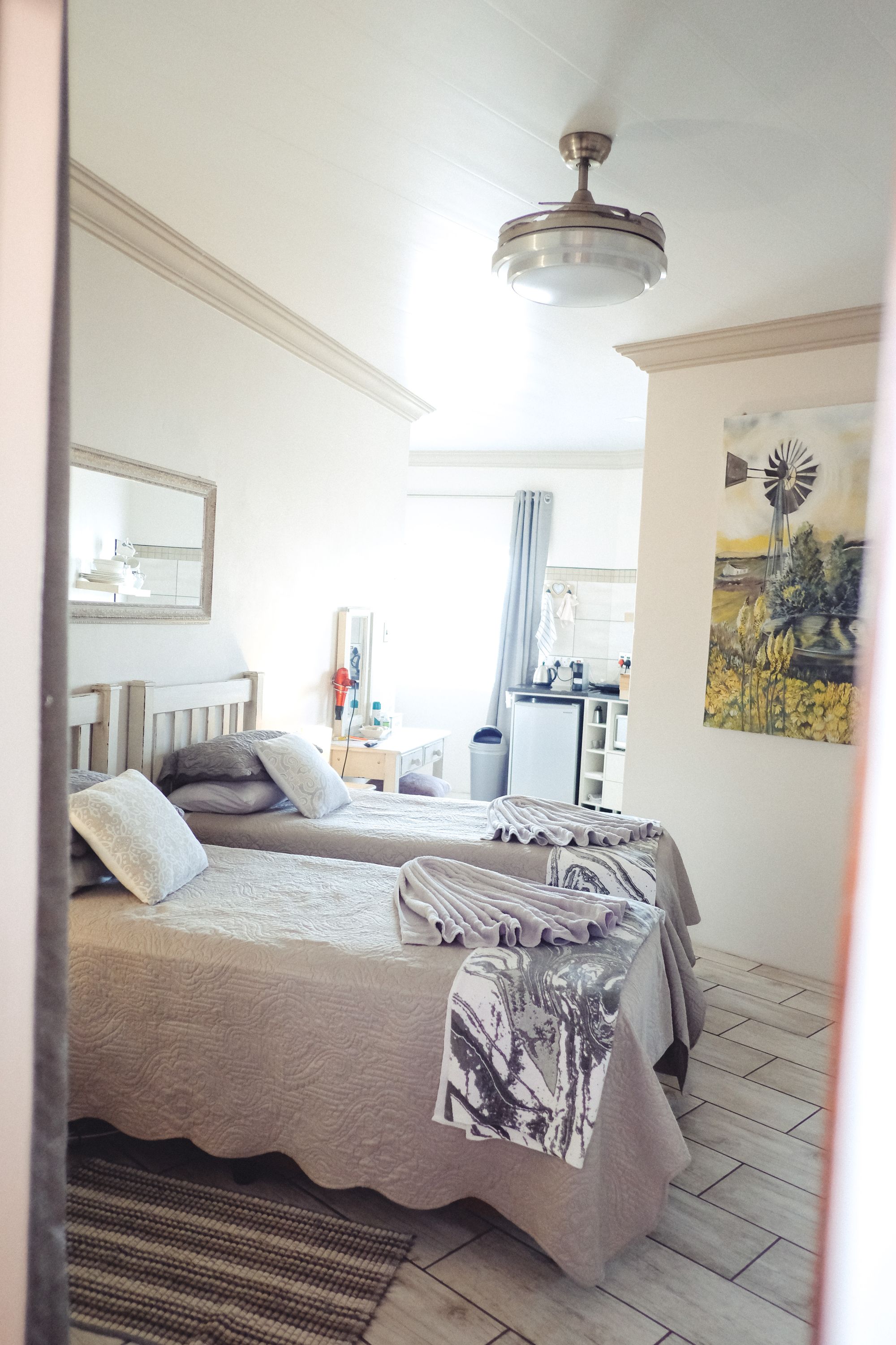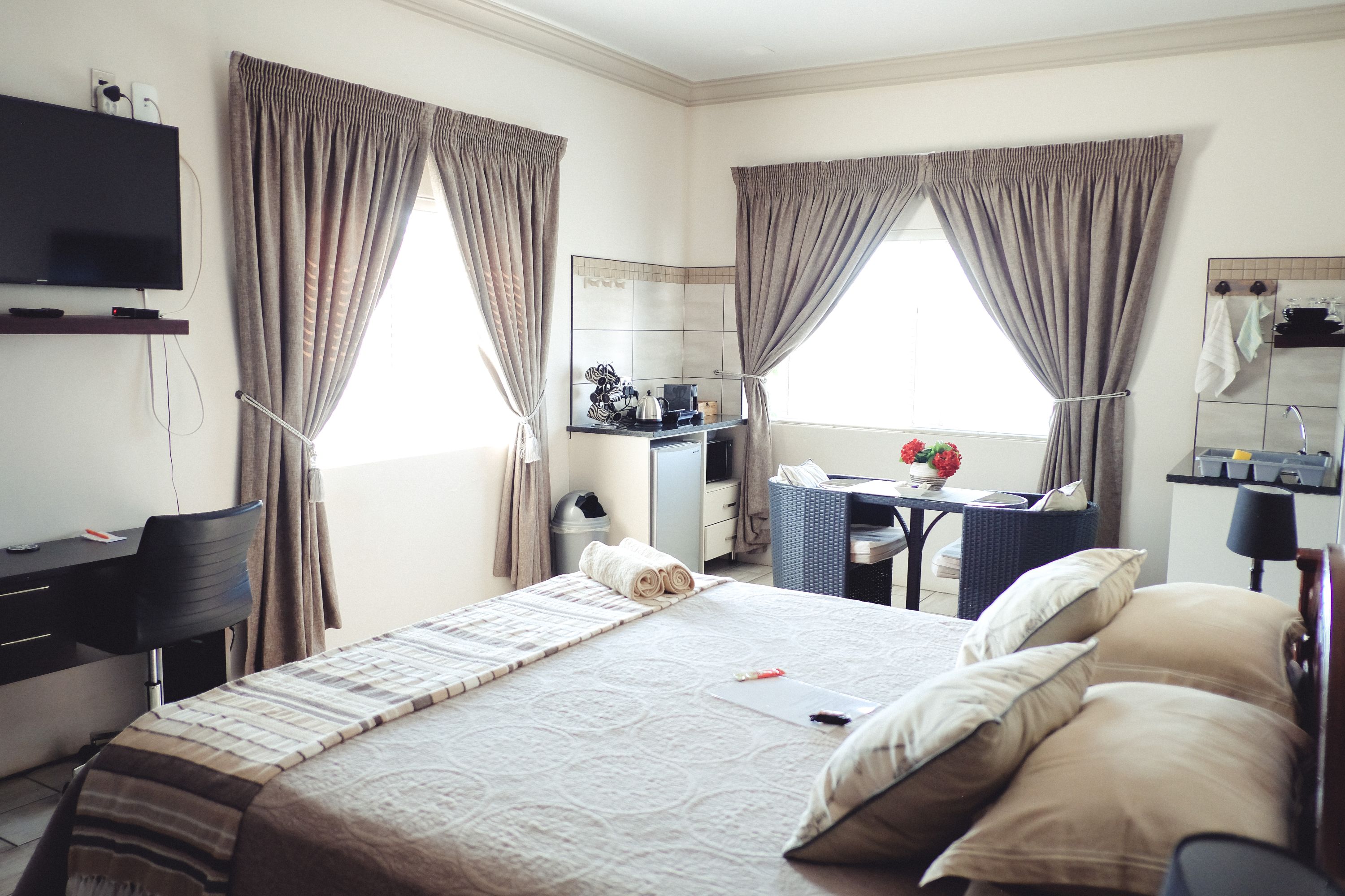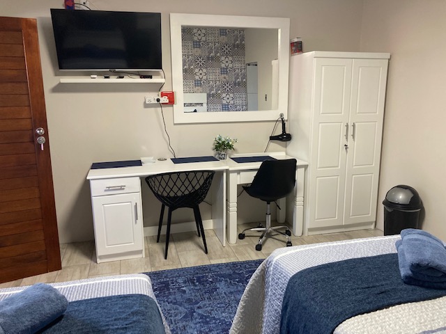 Ideal for students and representatives with two single beds. For small families the single beds can be converted to one King Size Bed and additional camping cot and/or mattress. Furnished with block out curtains and adjustable floor heating. Fully equipped Kitchenette with microwave, one plate induction stove, Toaster, Nespresso Coffee Machine, Small Bar Fridge, Full On suite bathroom with shower. Retractable ceiling fans with light and workstation with FREE WIFI. Open View Smart TV.